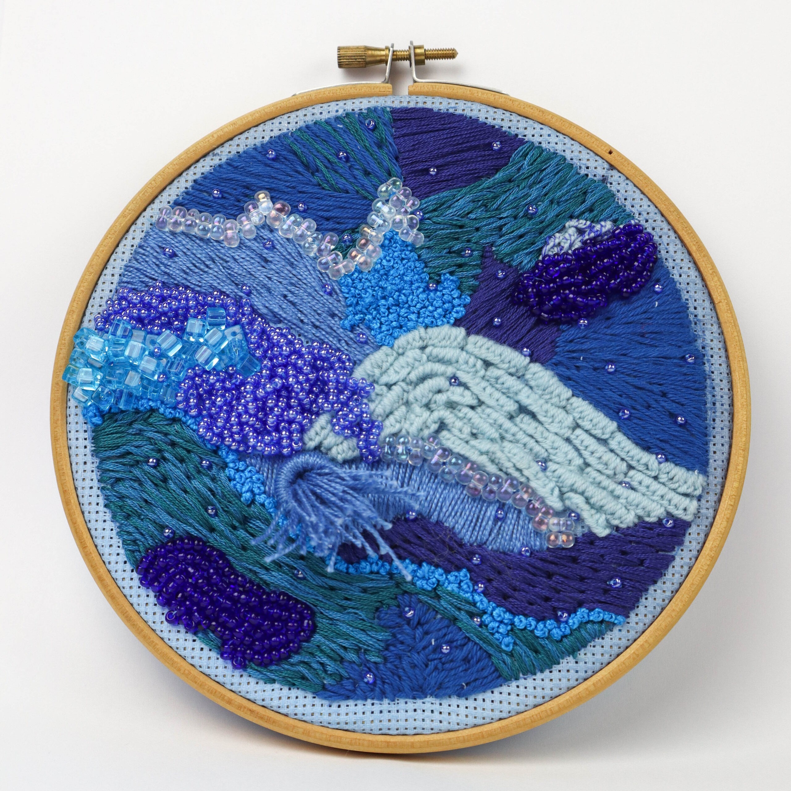 Ricamo di un dettaglio di un fiore ispirato ad una camelia blu immaginaria
